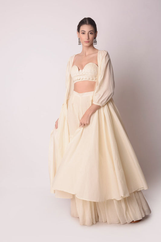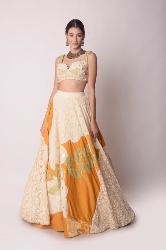 Asymmetrical Ivory & Mustard Layered Lehenga Set
