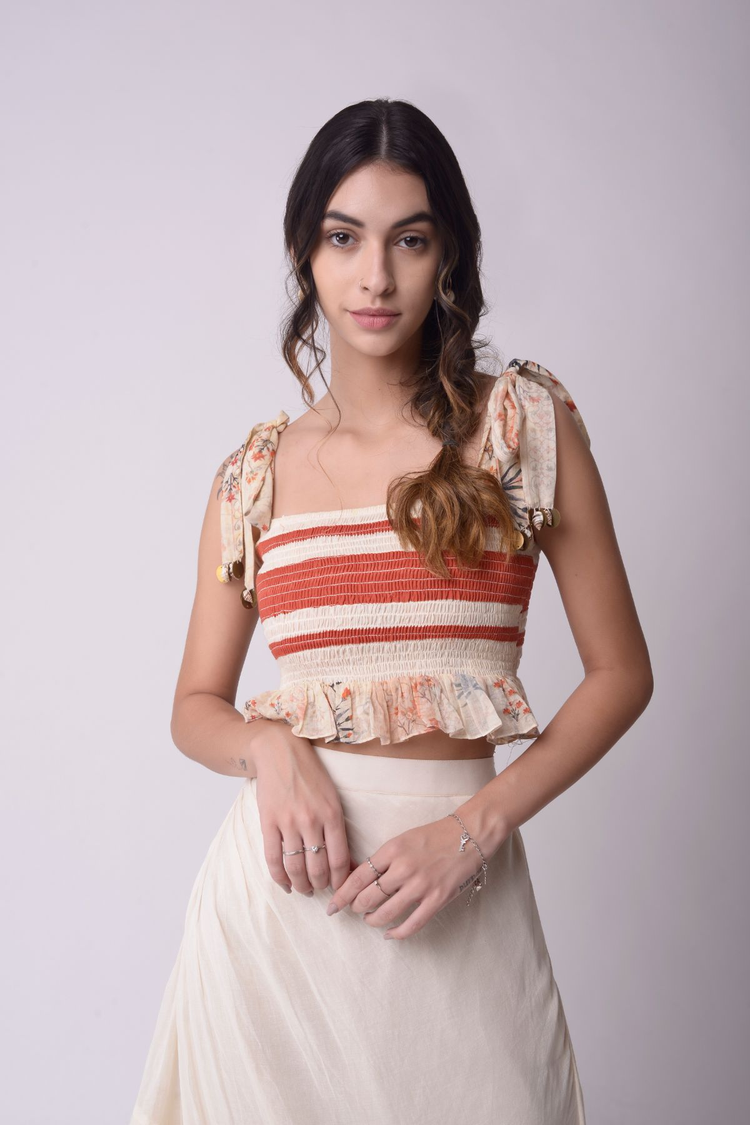 Asymmetrical Ruffle Skirt With Patchwork Smocking Crop Top