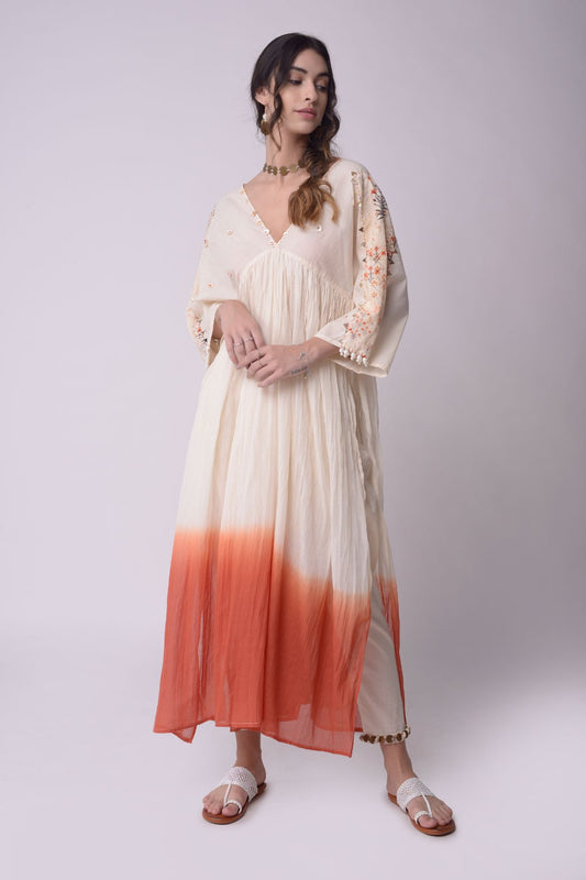 Ombre Kaftan Kurta With Cropped Pants And Patch Dupatta.