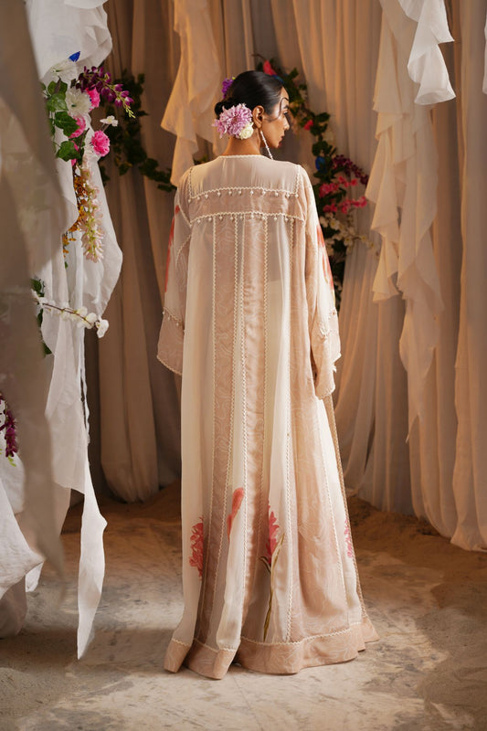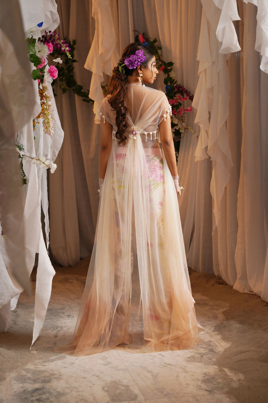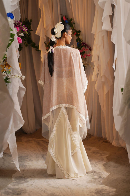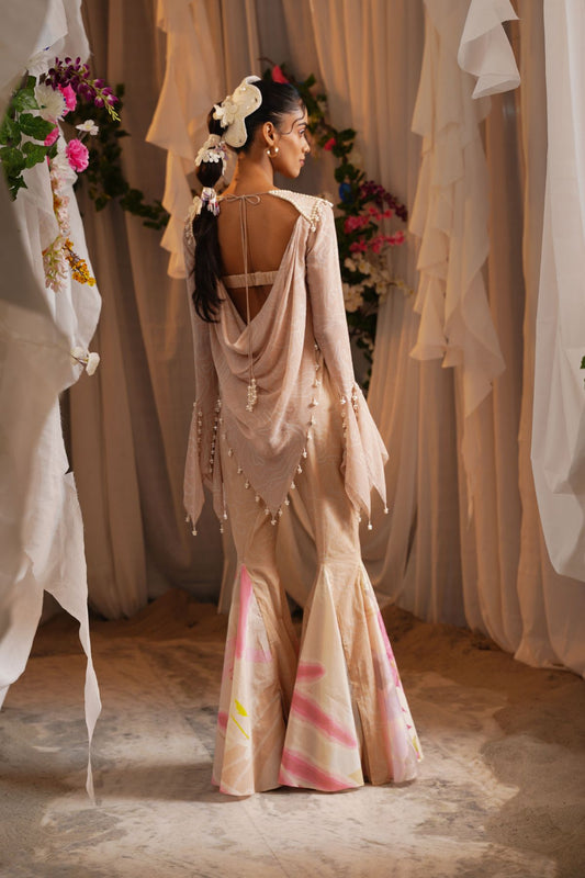 Printed Cowl Draped Cape With Beaded Bustier And Panelled Sharara