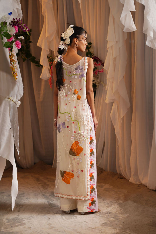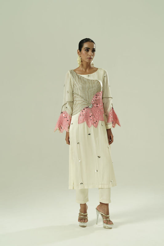 Printed Pearl Short Kurta With Floret Patch Cropped Pants And A Printed Bralet
