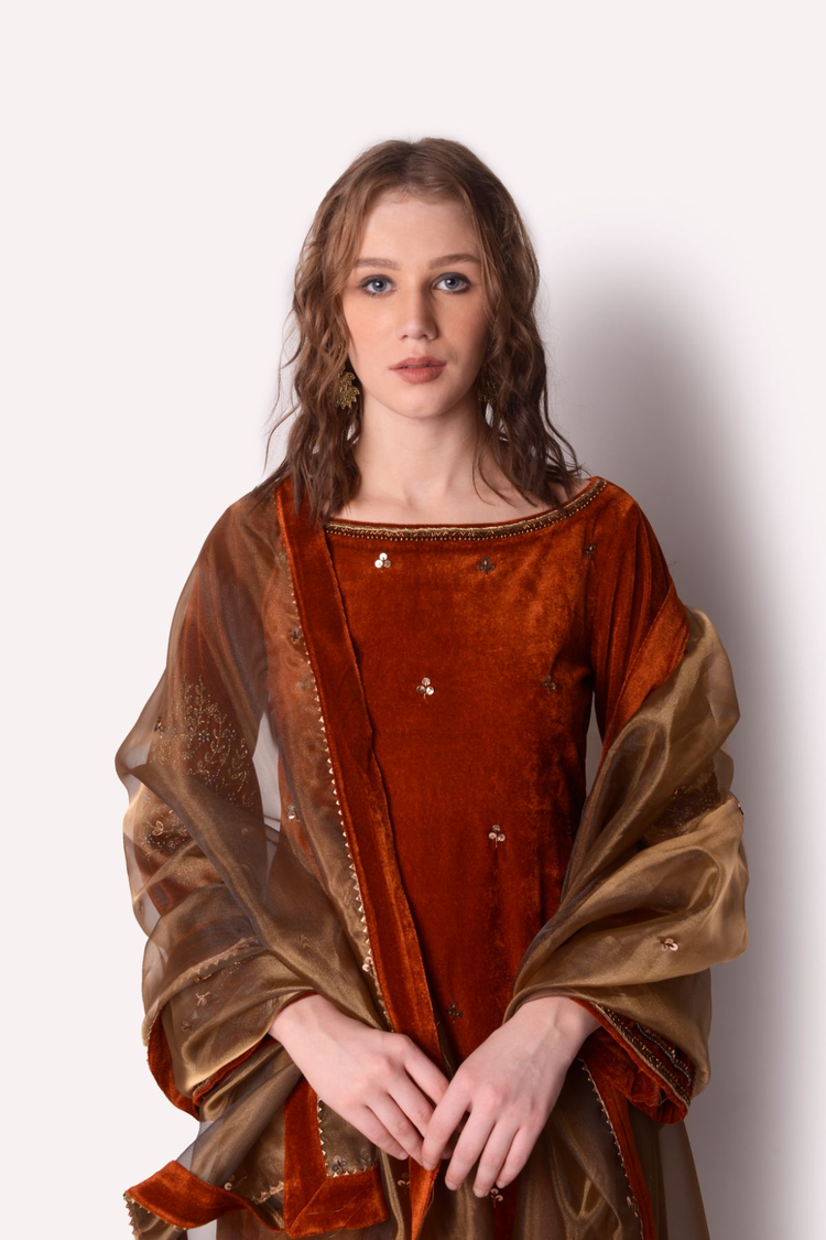 Embroidered Velvet Handkerchief Top With Tissue Bias Sharara
