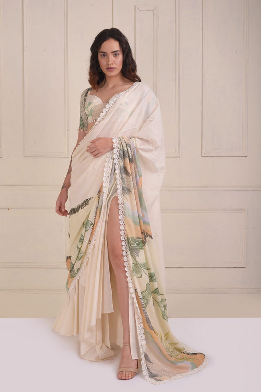Appliqué Printed Godet Saree With Patchwork Smocking Crop Top.