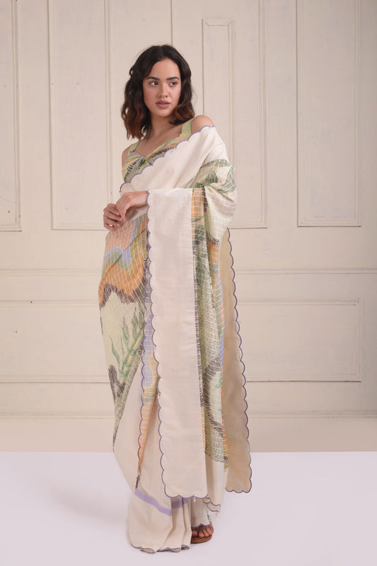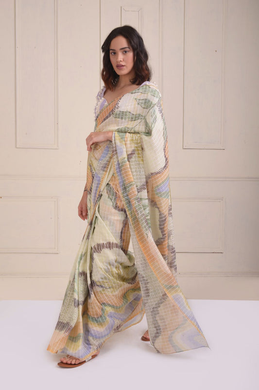 Panneled Multi-colour Saree With Solid Jade Blouse
