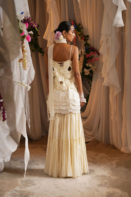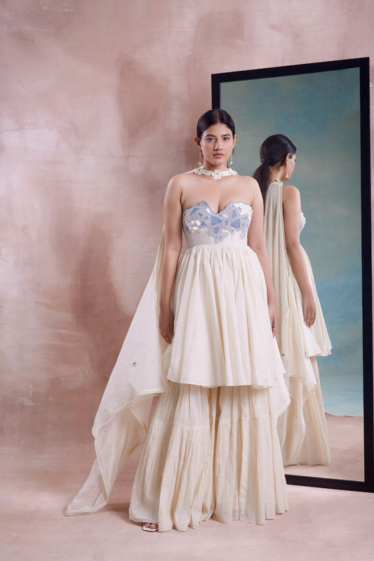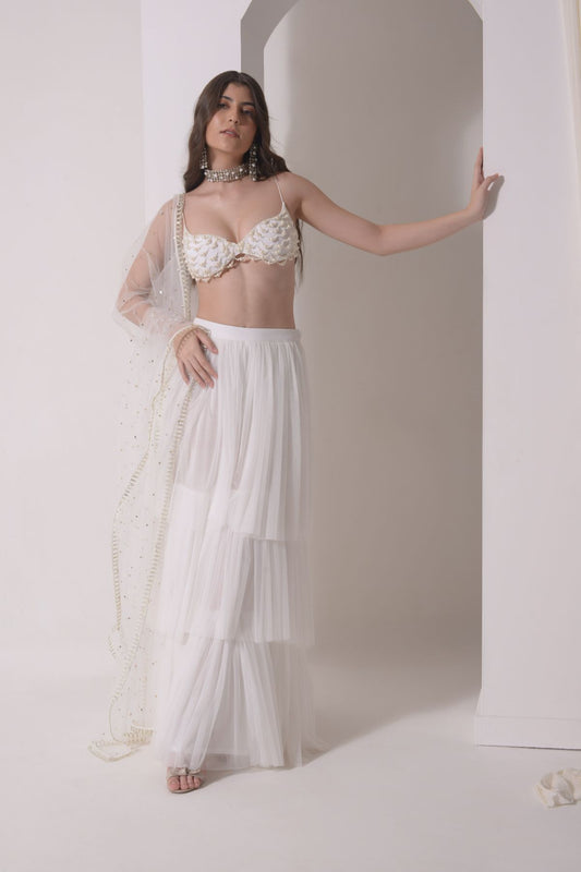 Tiered tulle sharara with beaded bustier and tulle dupatta