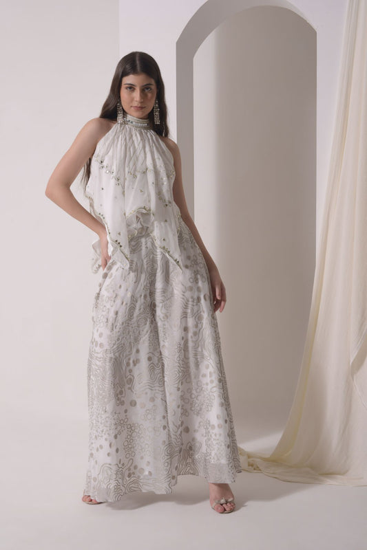Scalloped Floret Kaftan Wiyh Godet Sharar And A Printed Bustier