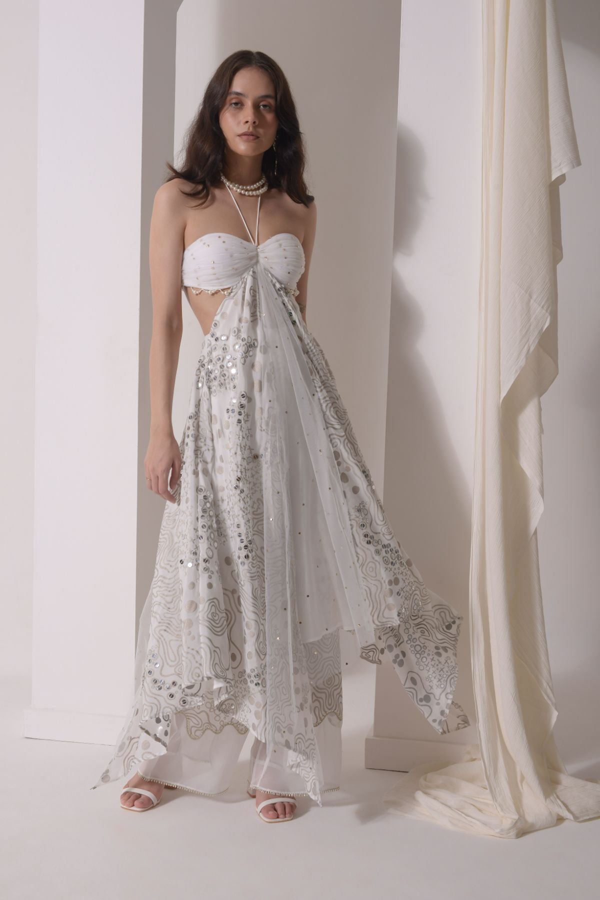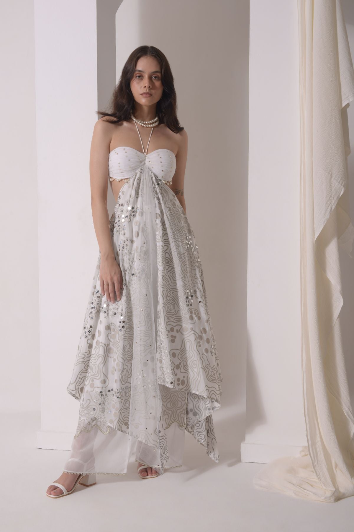 Additional Details: Ruched,Handkerchief flare; halter strings; patchwork hem