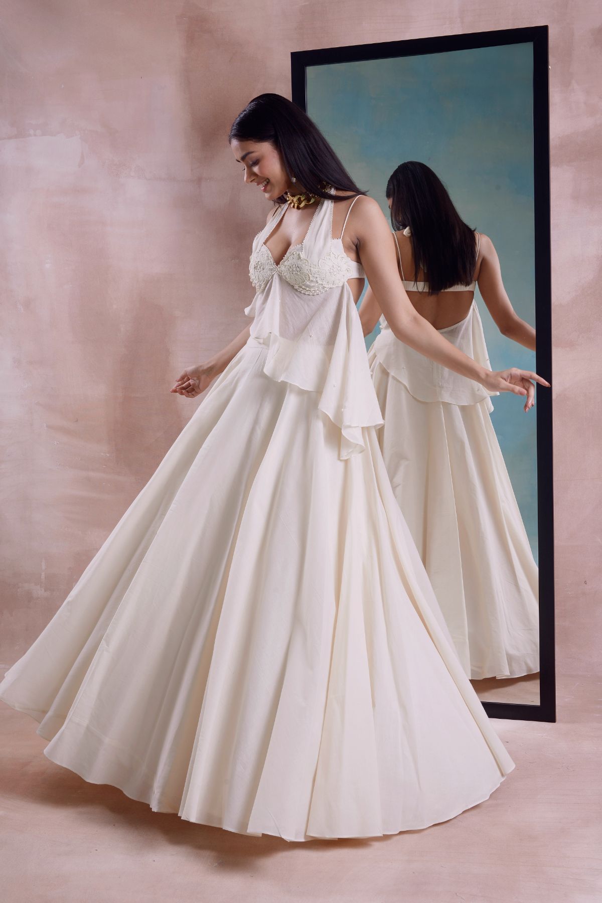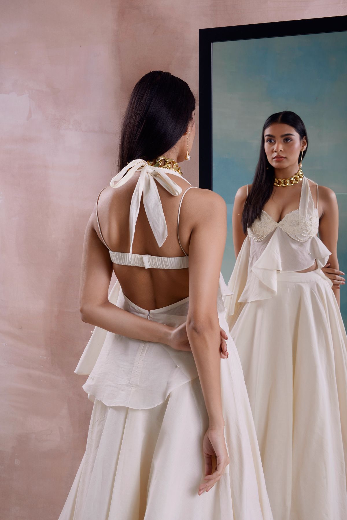 Asymmetrical peplum, halter tie up, placement patchwork, beaded cups