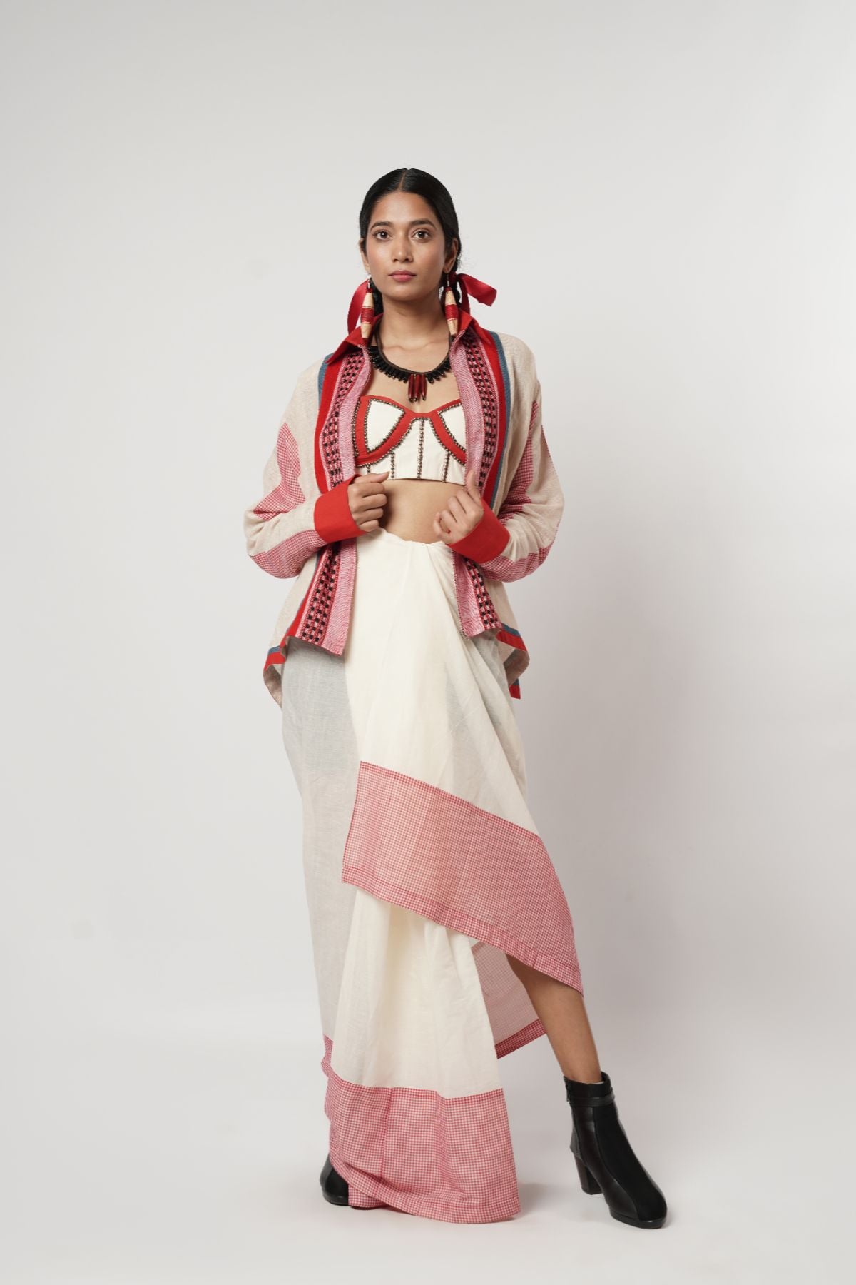 Paneled over shirt; beaded bra corset; draped gamcha lungi skirt