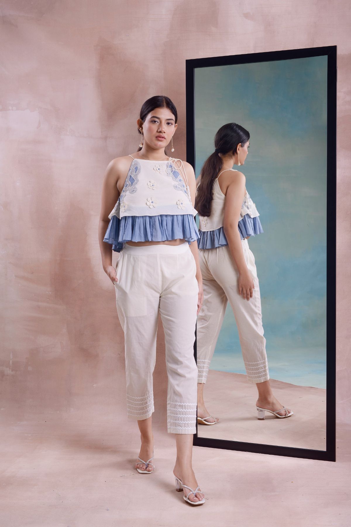 Placement patchwork on layered top, one shoulder tie up; cropped straight pants