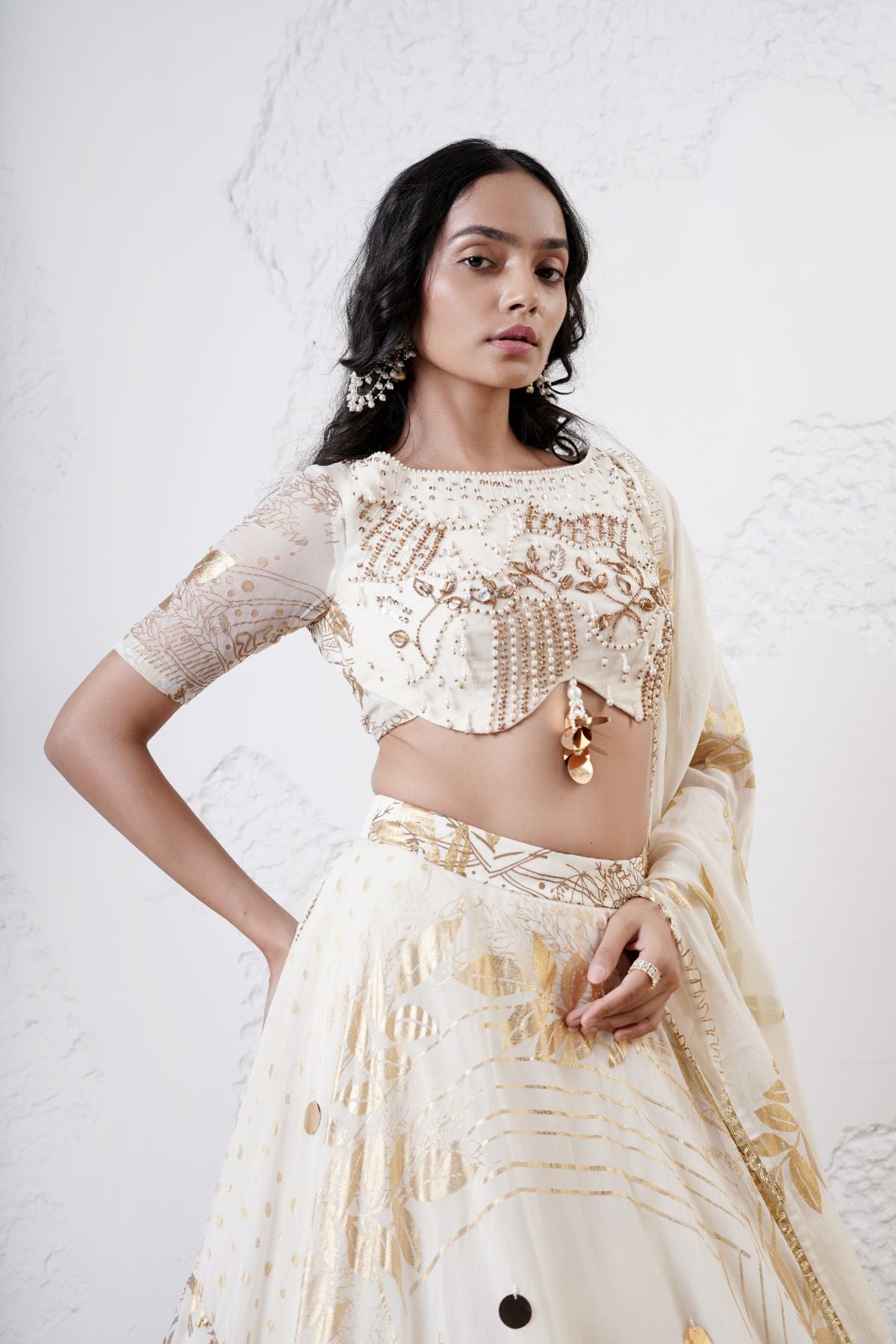 Foil Scarf Lehenga with Embroidered Blouse and Foil Dupatta