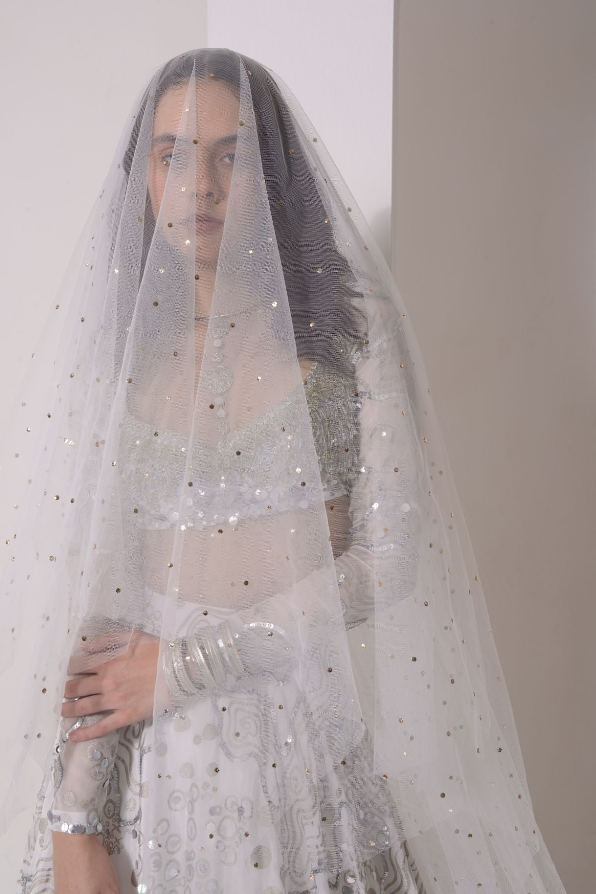 Foil twinkling lehenga with embroidered blouse and dupatta