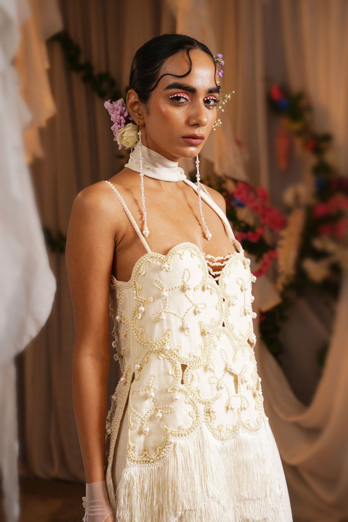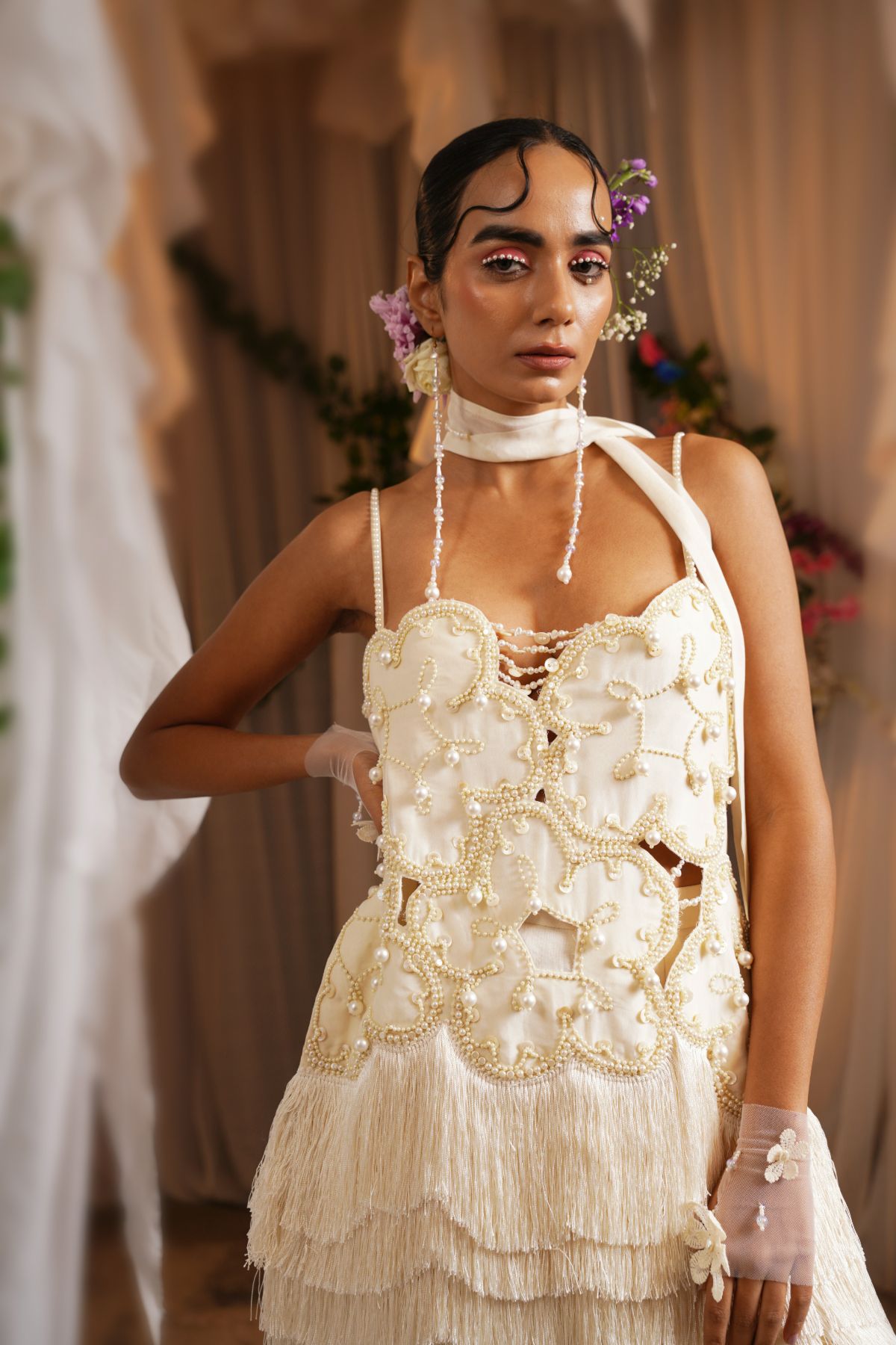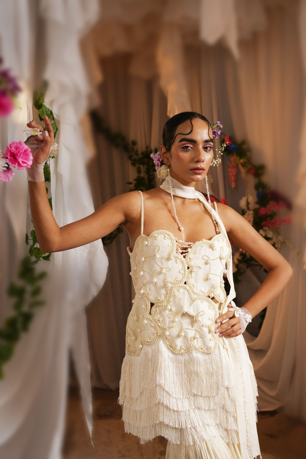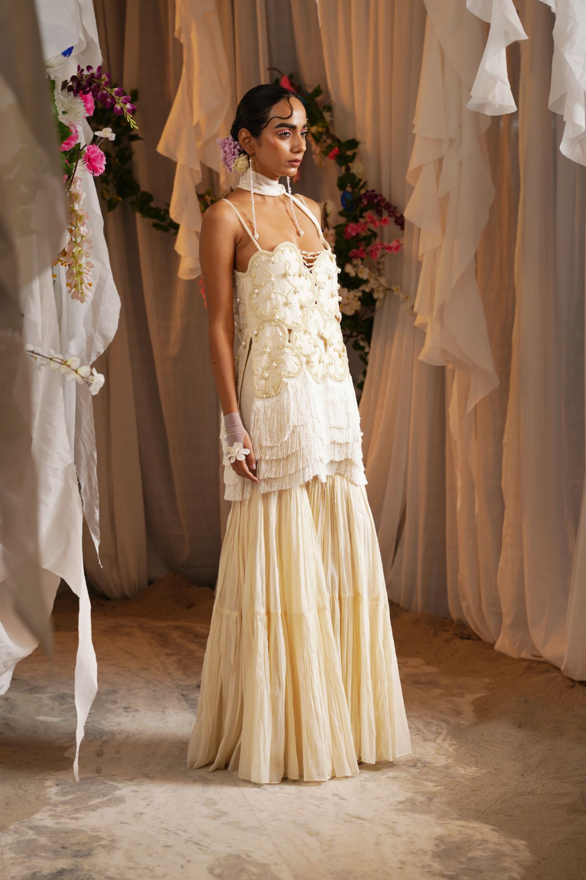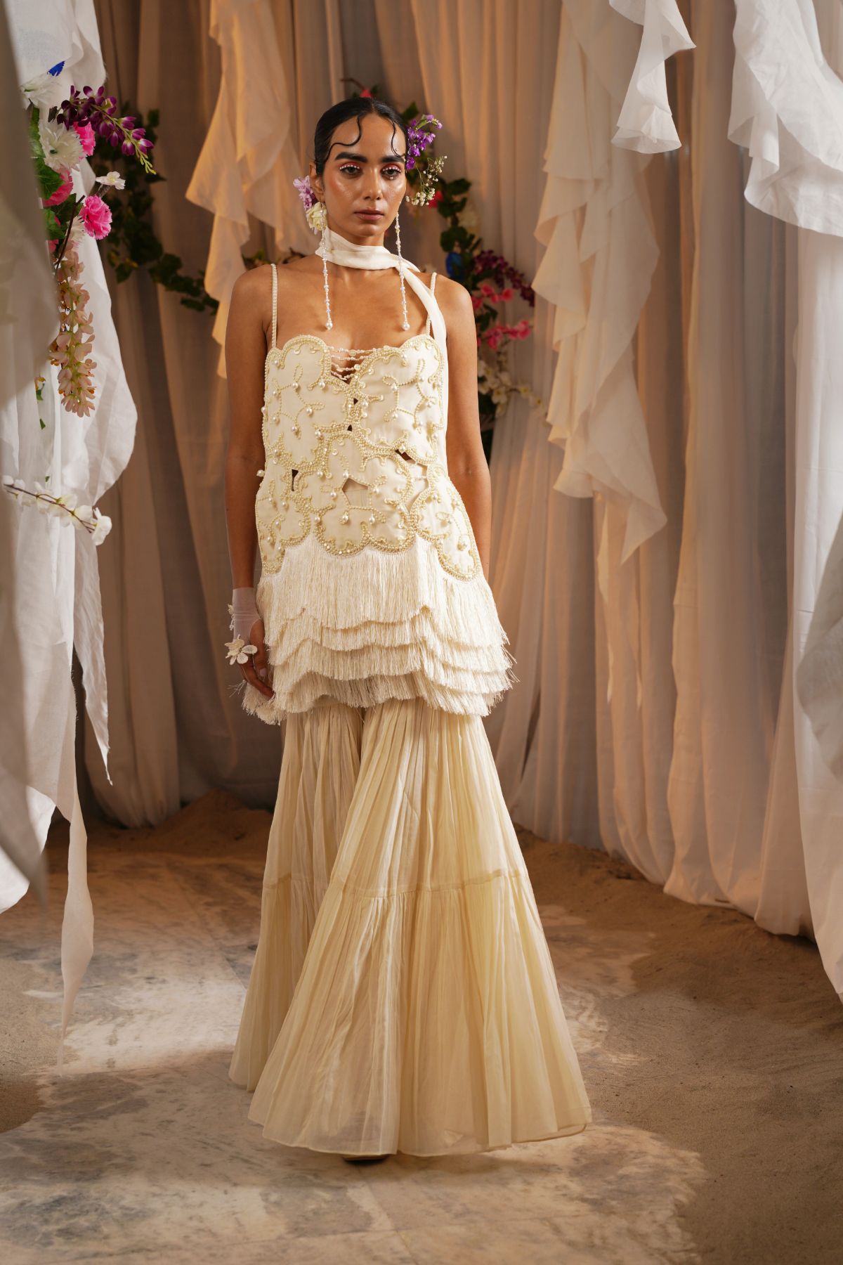 Floret pearl embroidery; fringe details; gathered sharara; beaded style dupatta