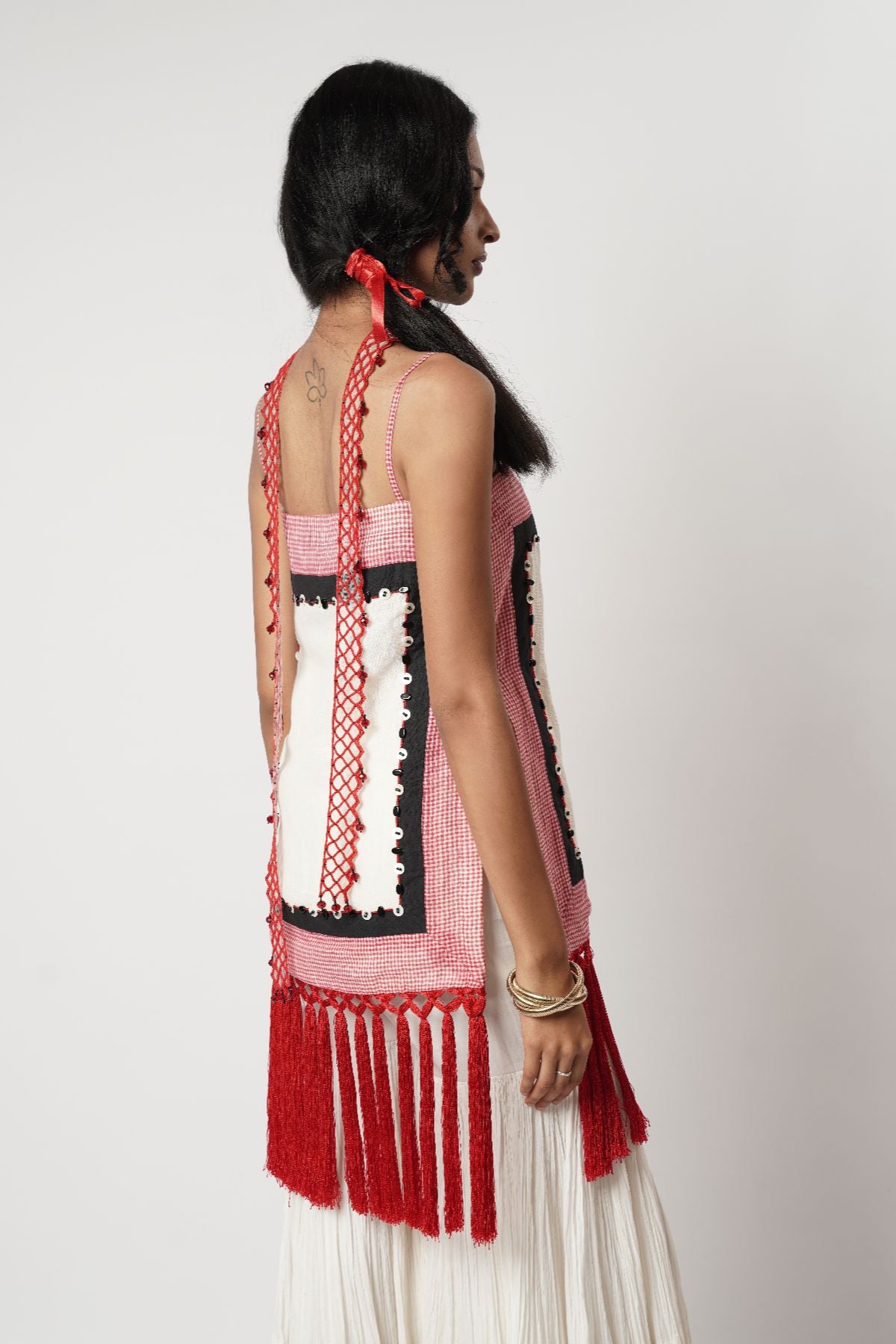 Cotton mesh tunic; floret embroidery on waist; bias sharara; beaded bra-corset