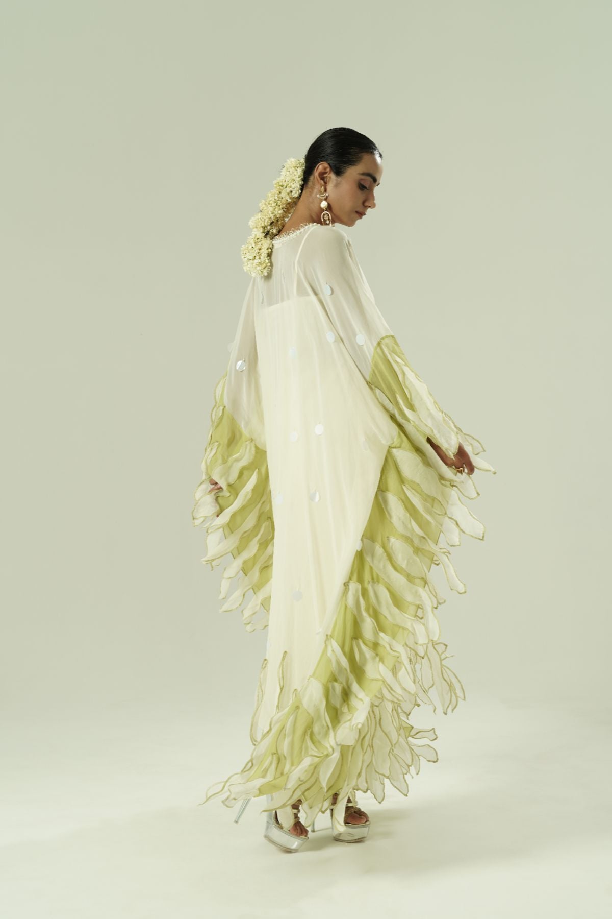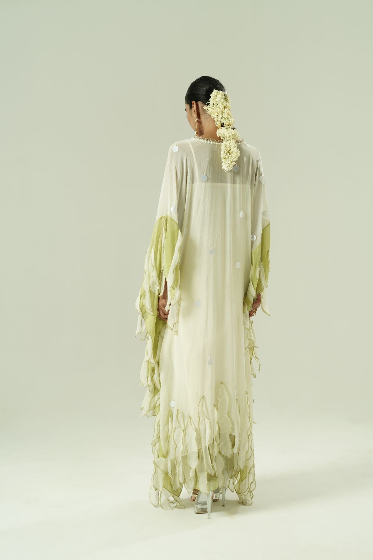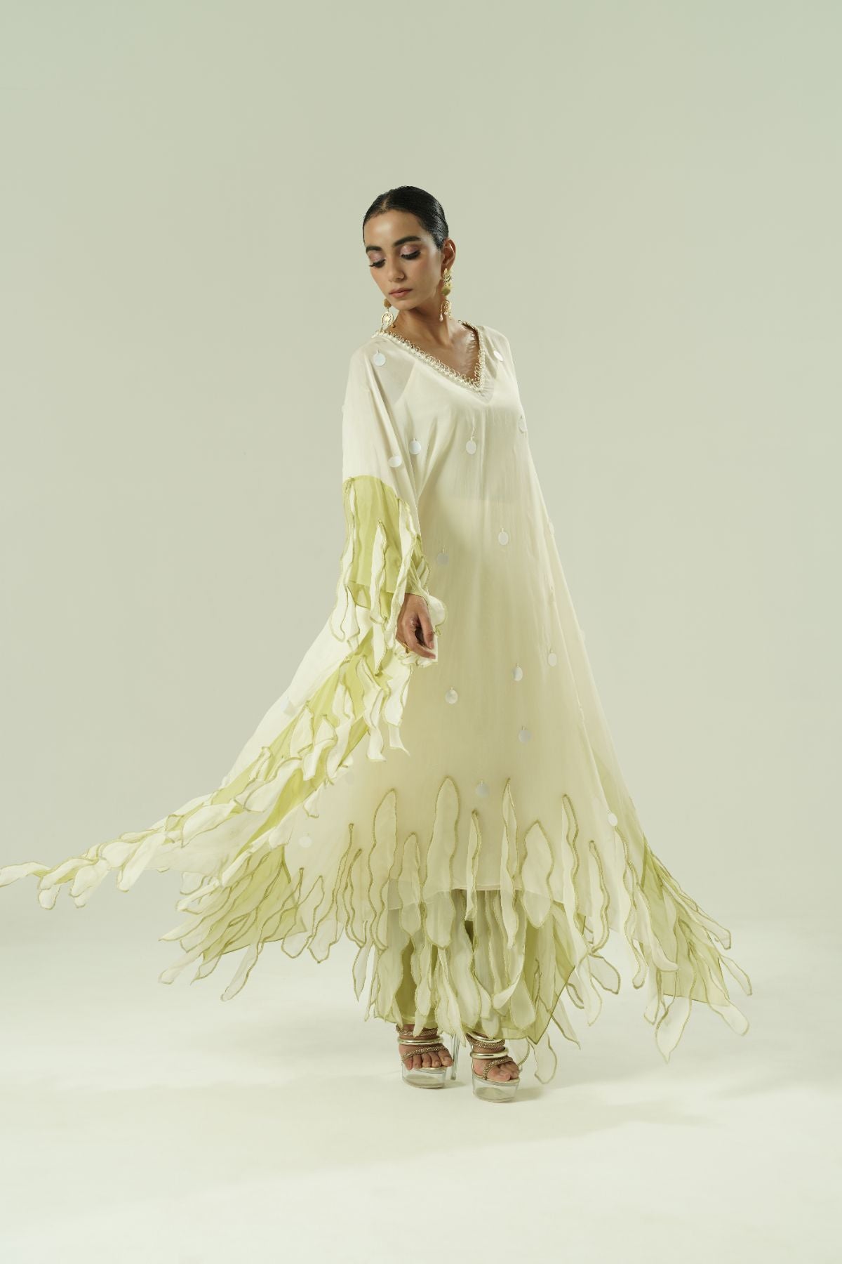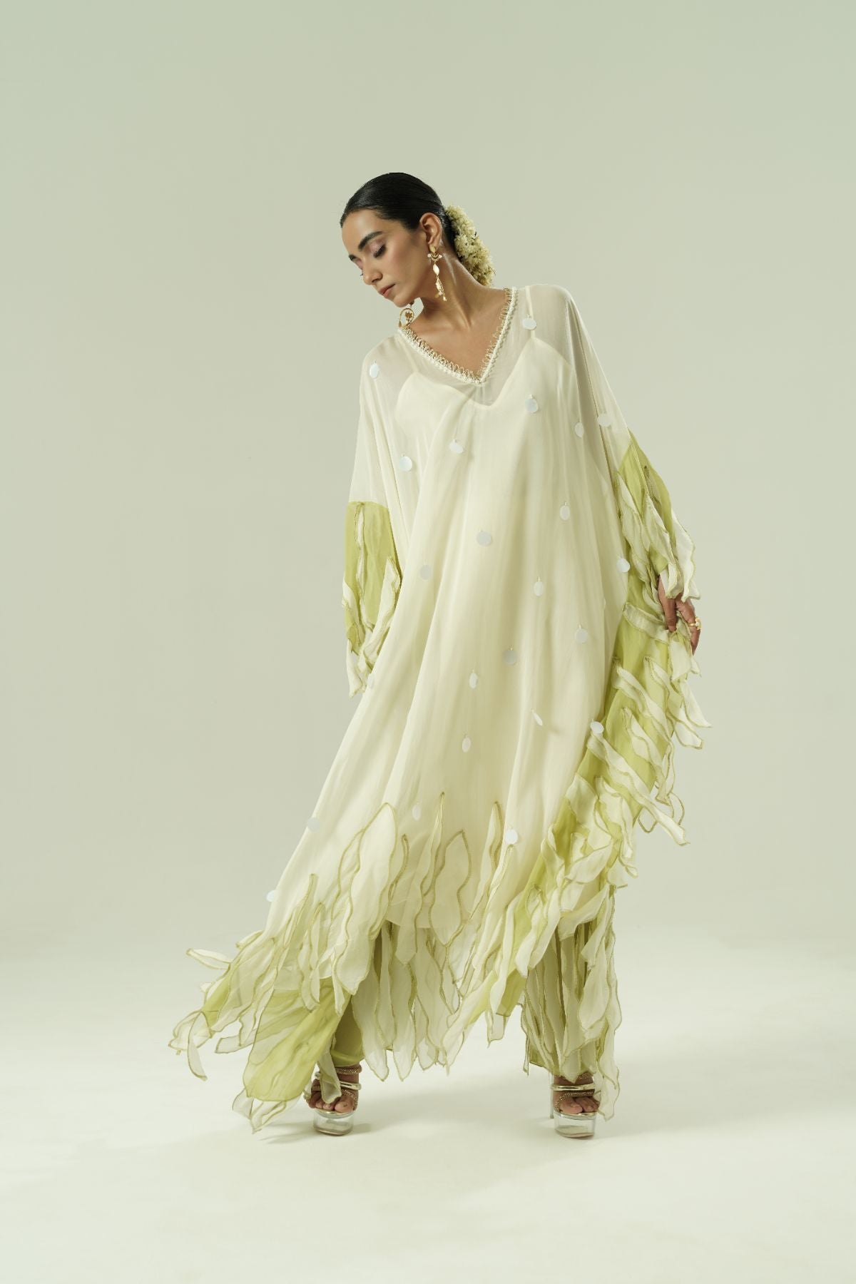 Paneled kaftan; leaflet details; beadwork around neck; colour block leaf straight pants; cotton slip