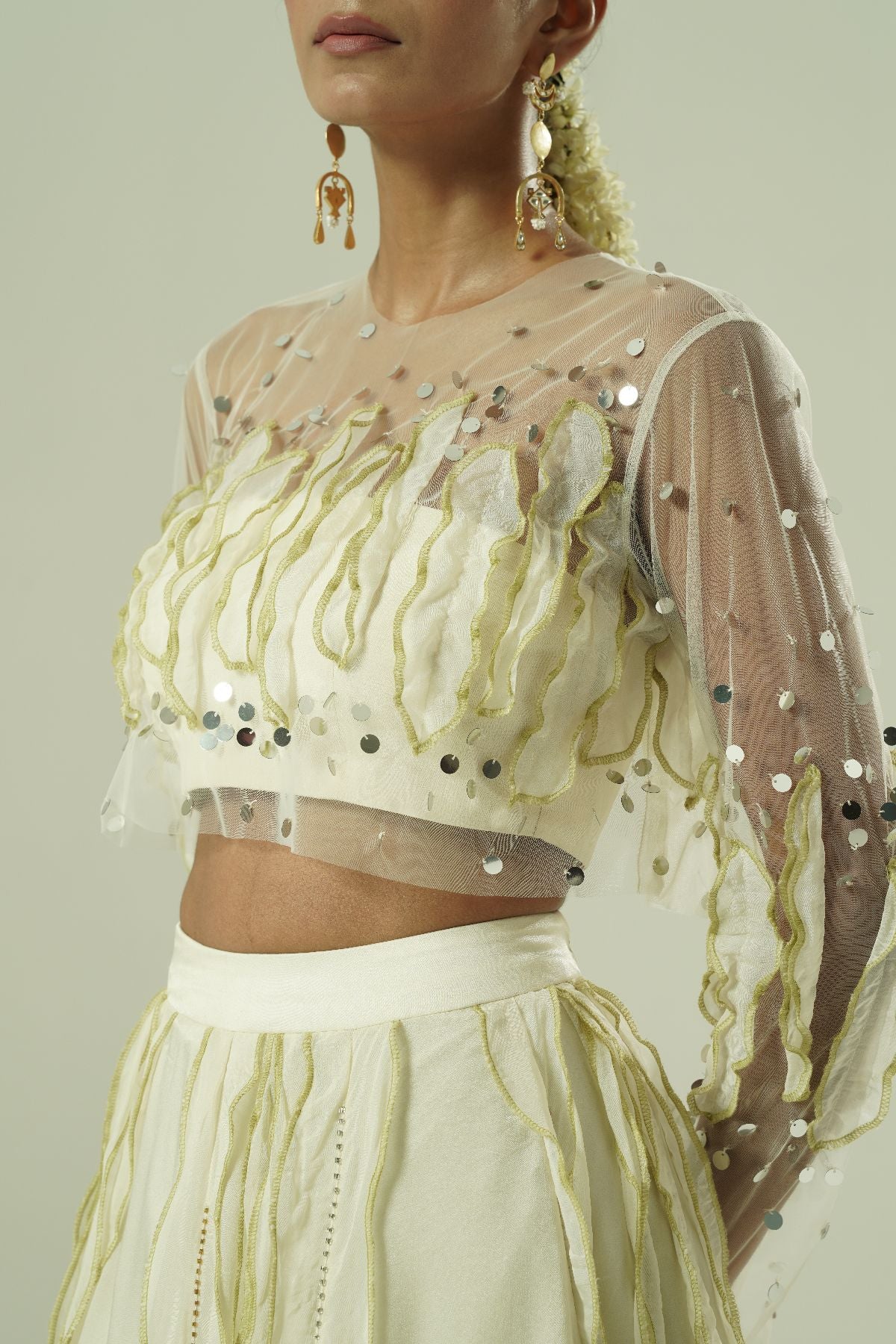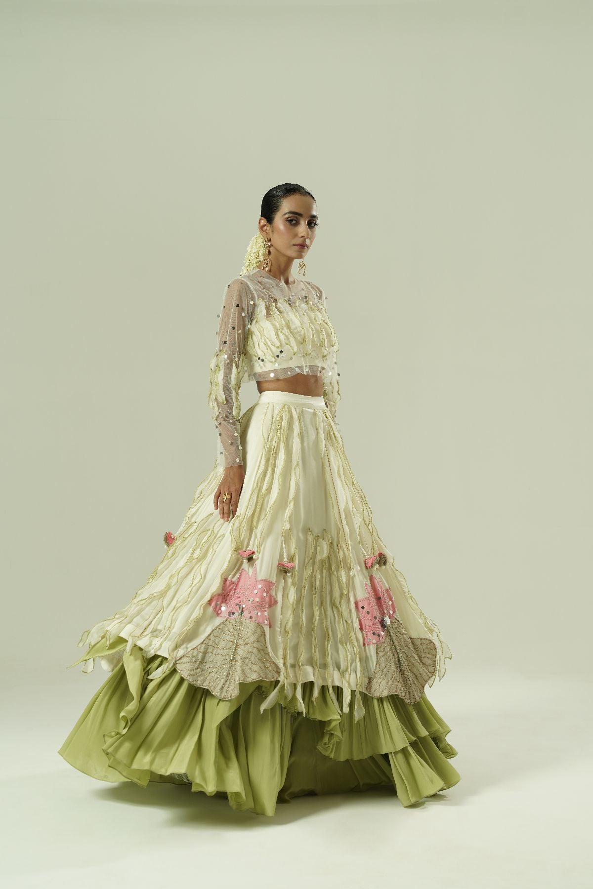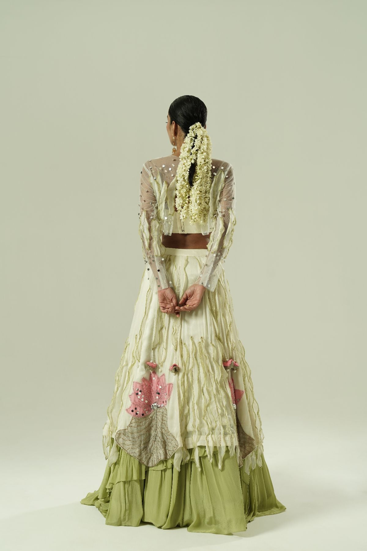 Lotus patch on kali; leaflet details; ; scalloped hemline; layered lehenga; sequin scatter on to