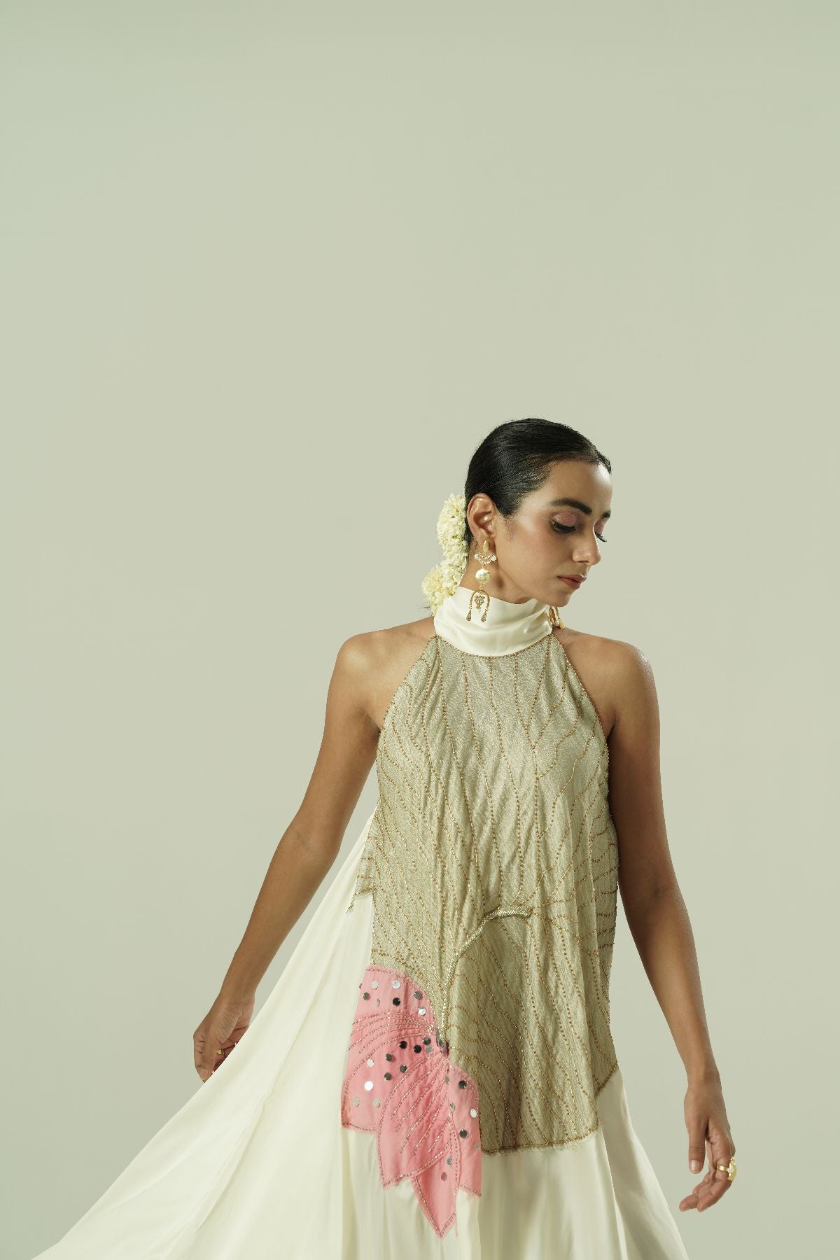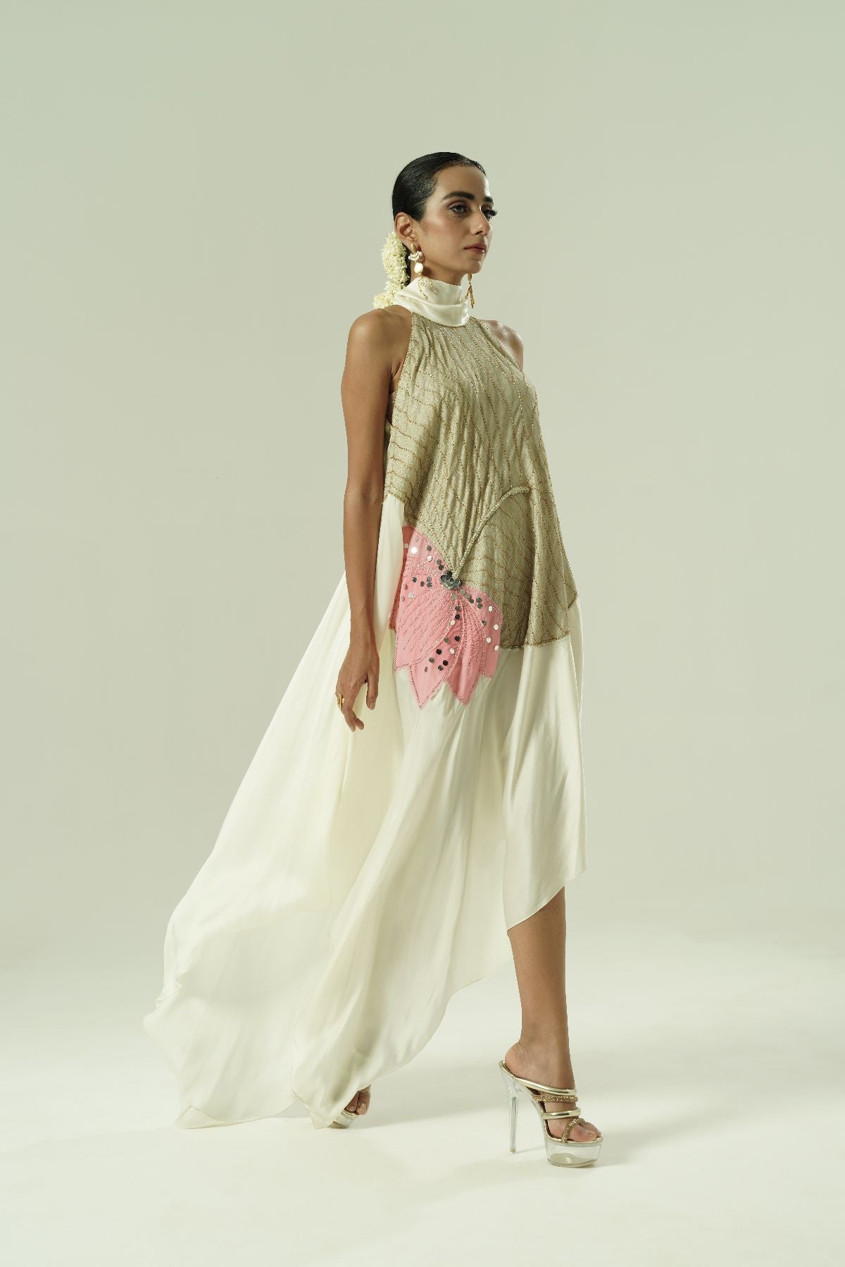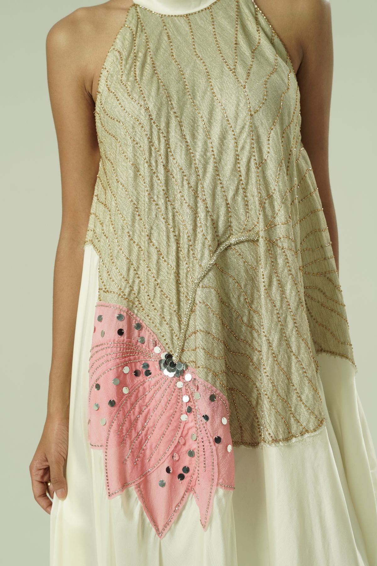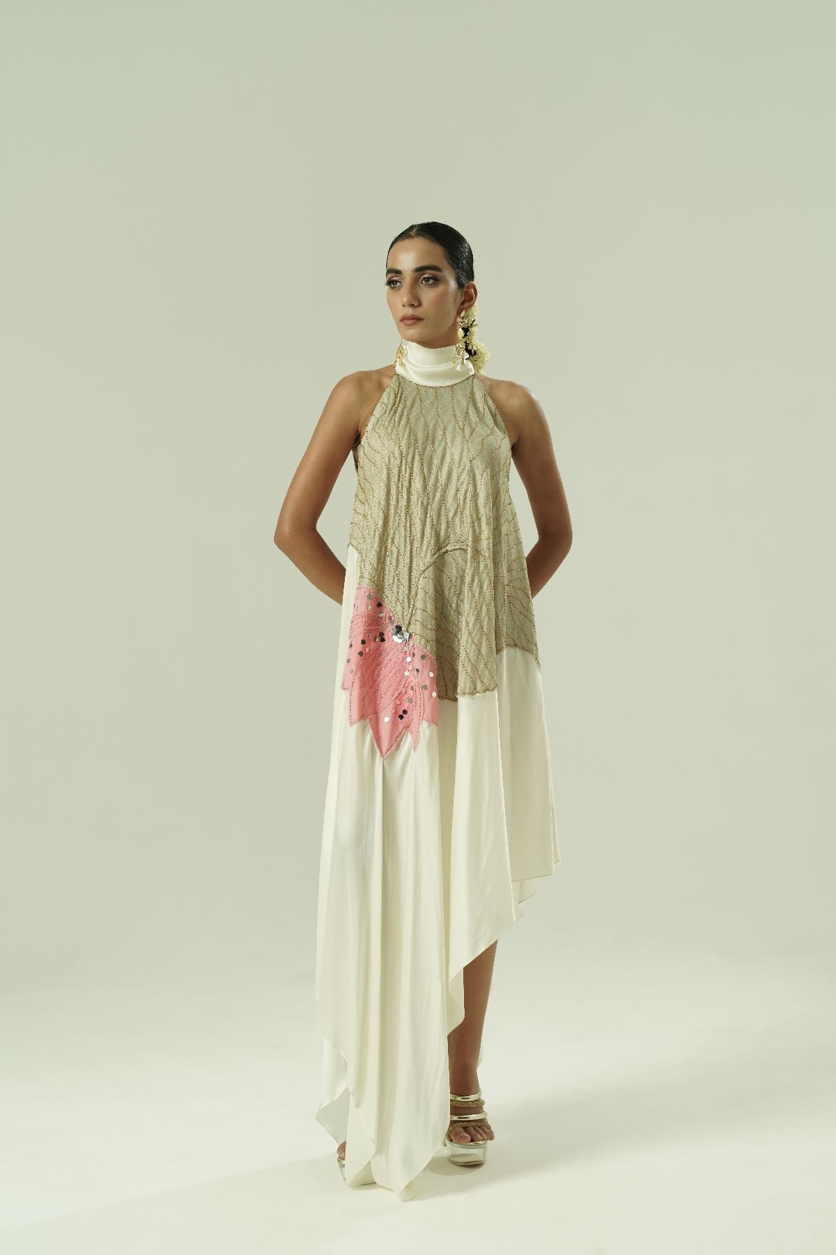 Lilly patchwork dress; halter tie-up; asymmetric hem