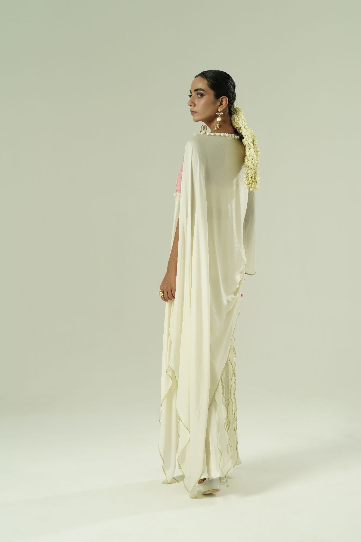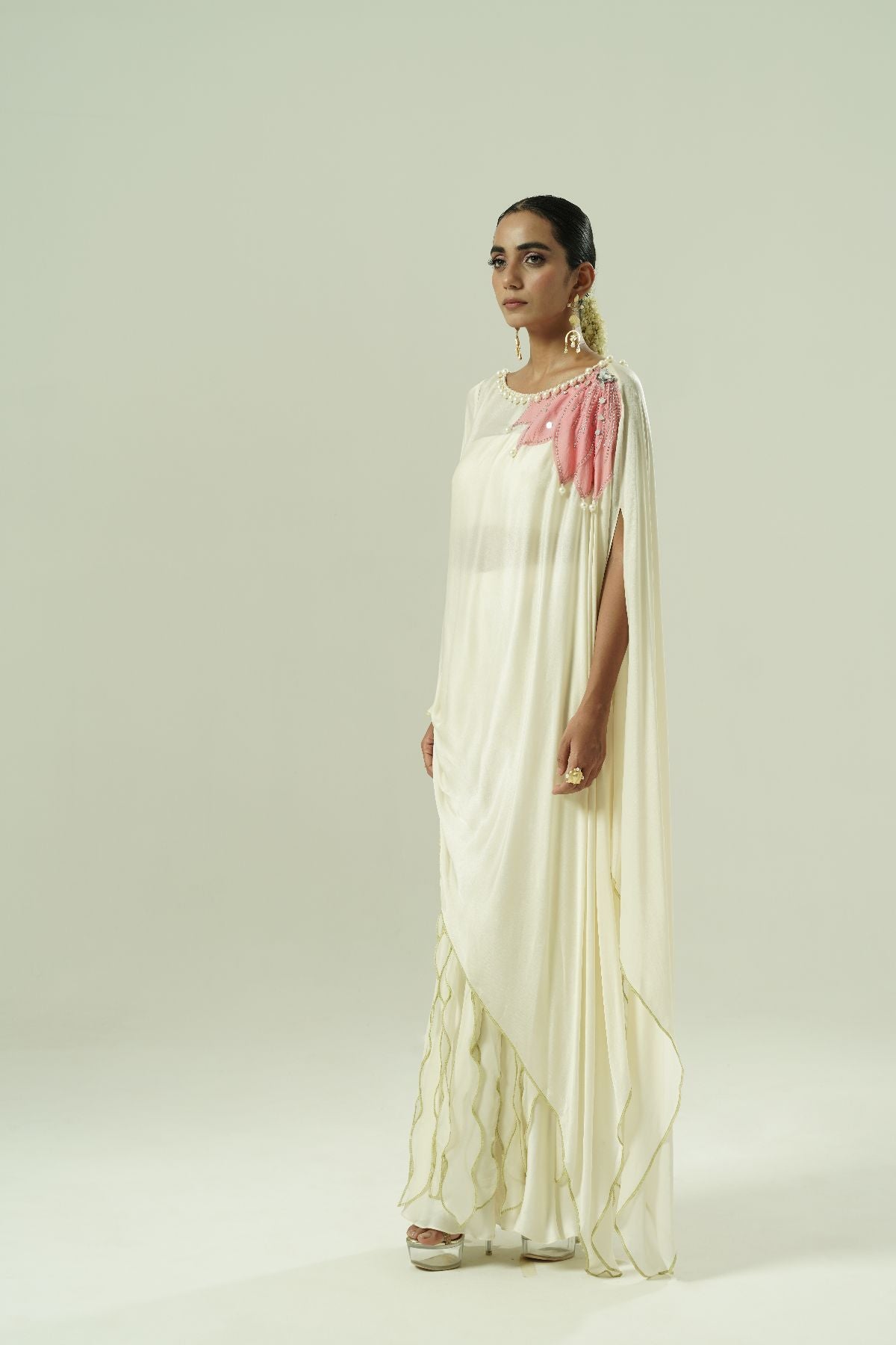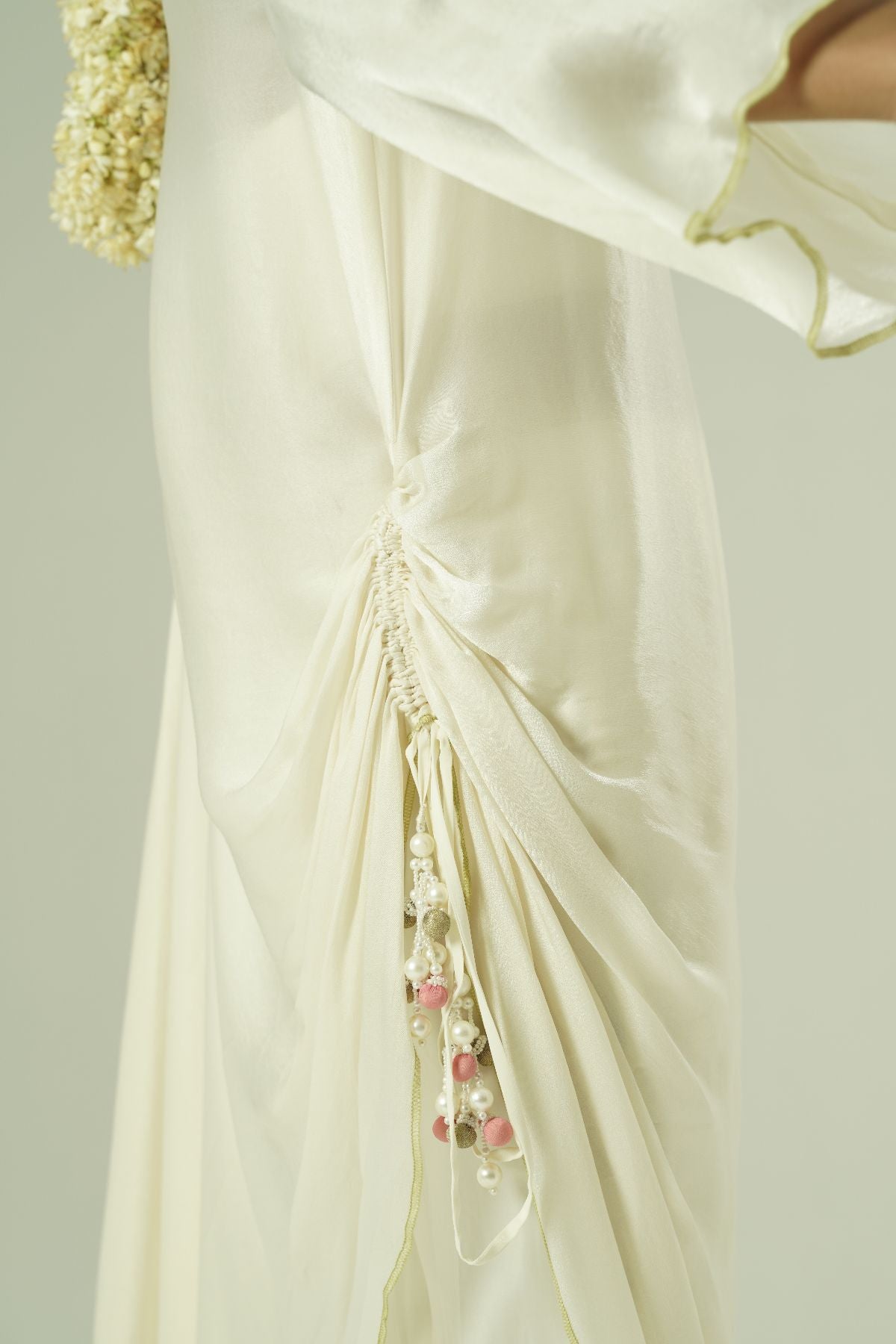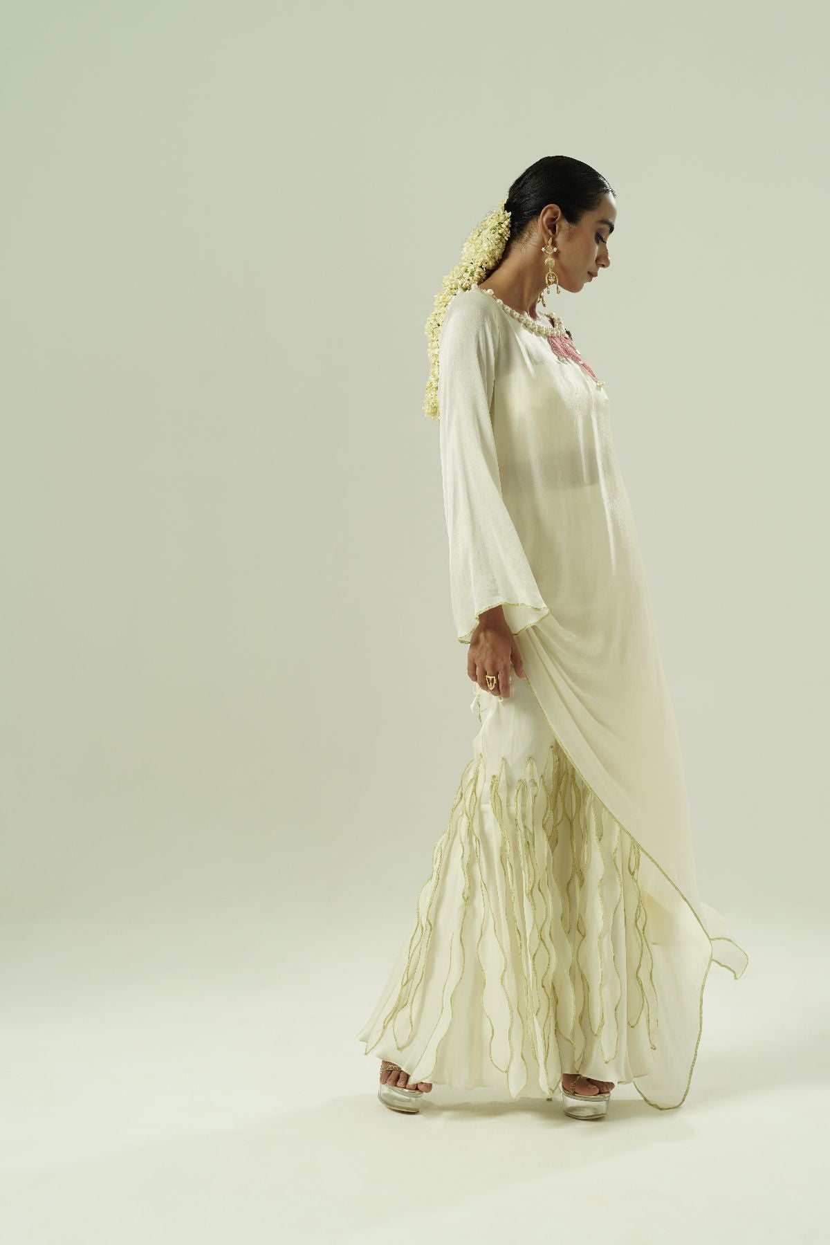 Lilly patch; a line sleeves on right; drawstring details on right; high slit on left side; inner tube; leaf sharara pants