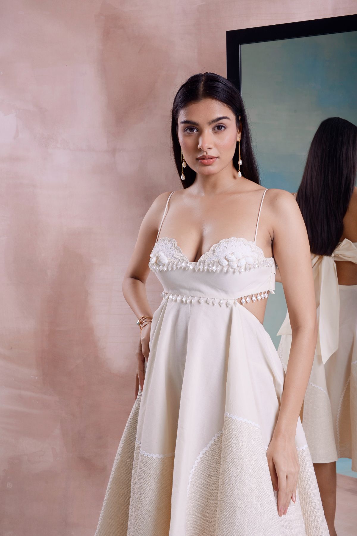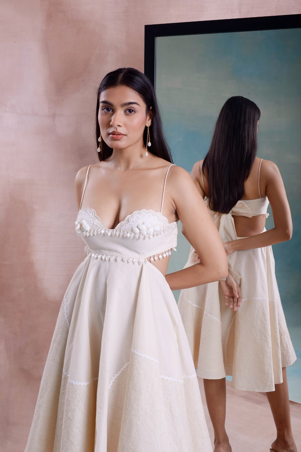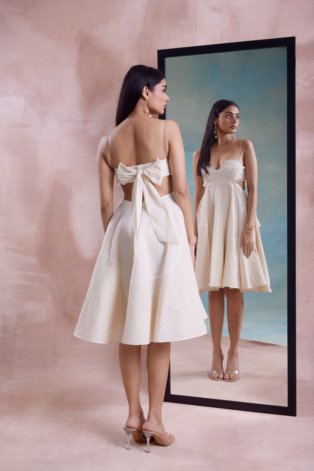Placement patchwork on bust with hanging beads; bow detail on back; patchwork flared dress