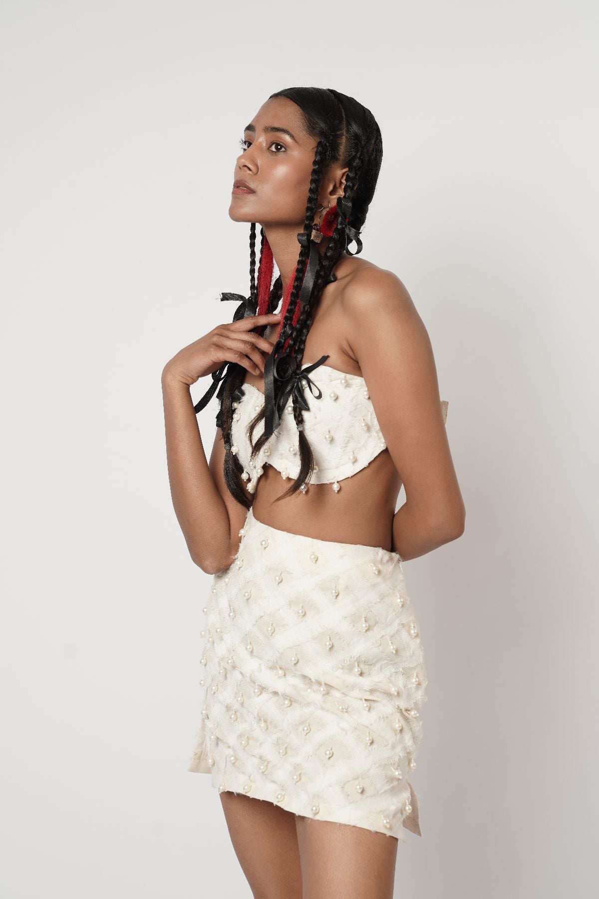 Beaded bustier; mini skirt