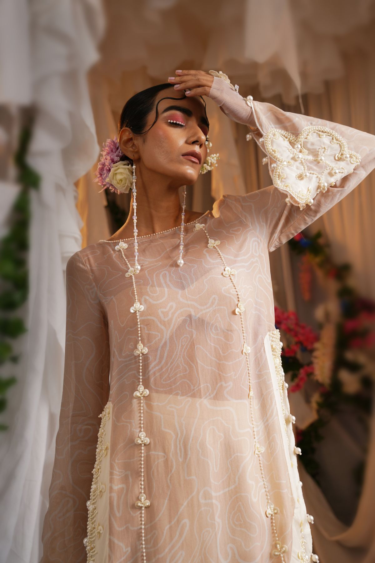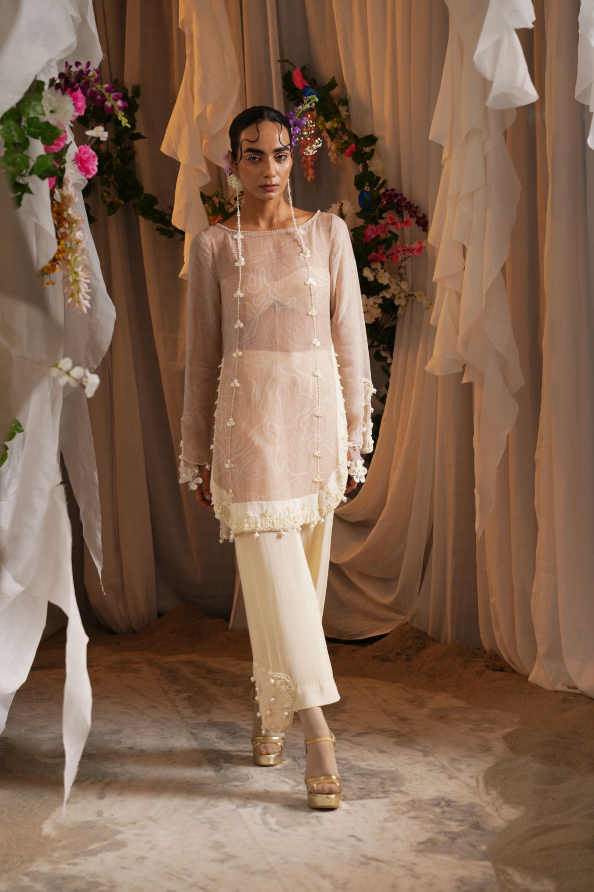Peral embroidery on kurta; pearl embroidered flower patch on pants