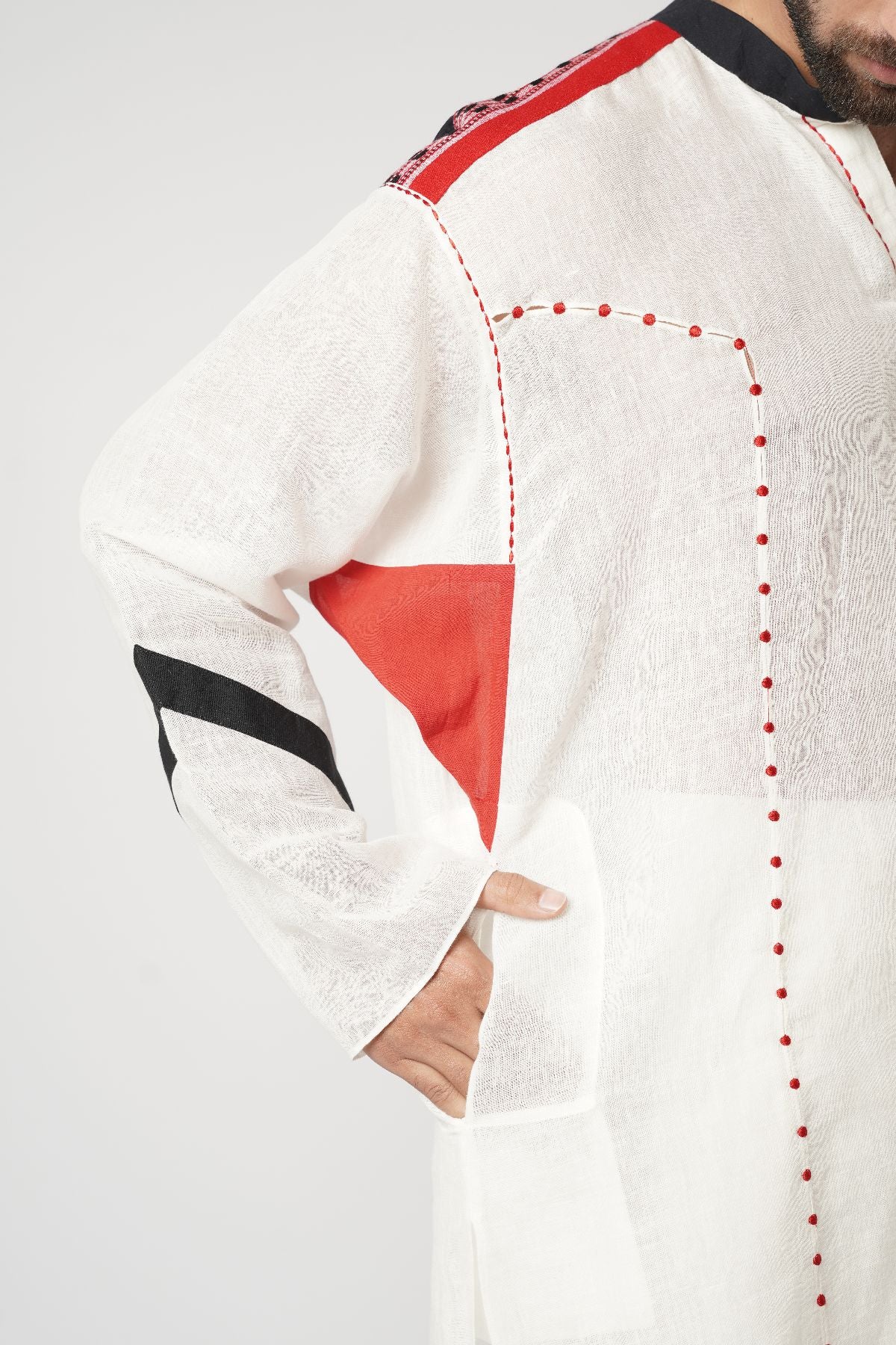 Oversized kurta with red gusset and stich details; black back yoke with box pleats running down; straight pants