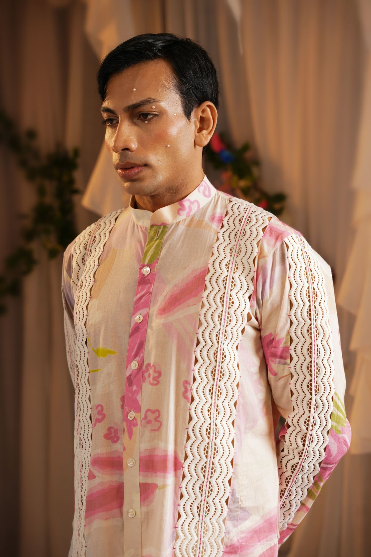 Embroidered lace panel kurta; front open shirt style; fringes on pants