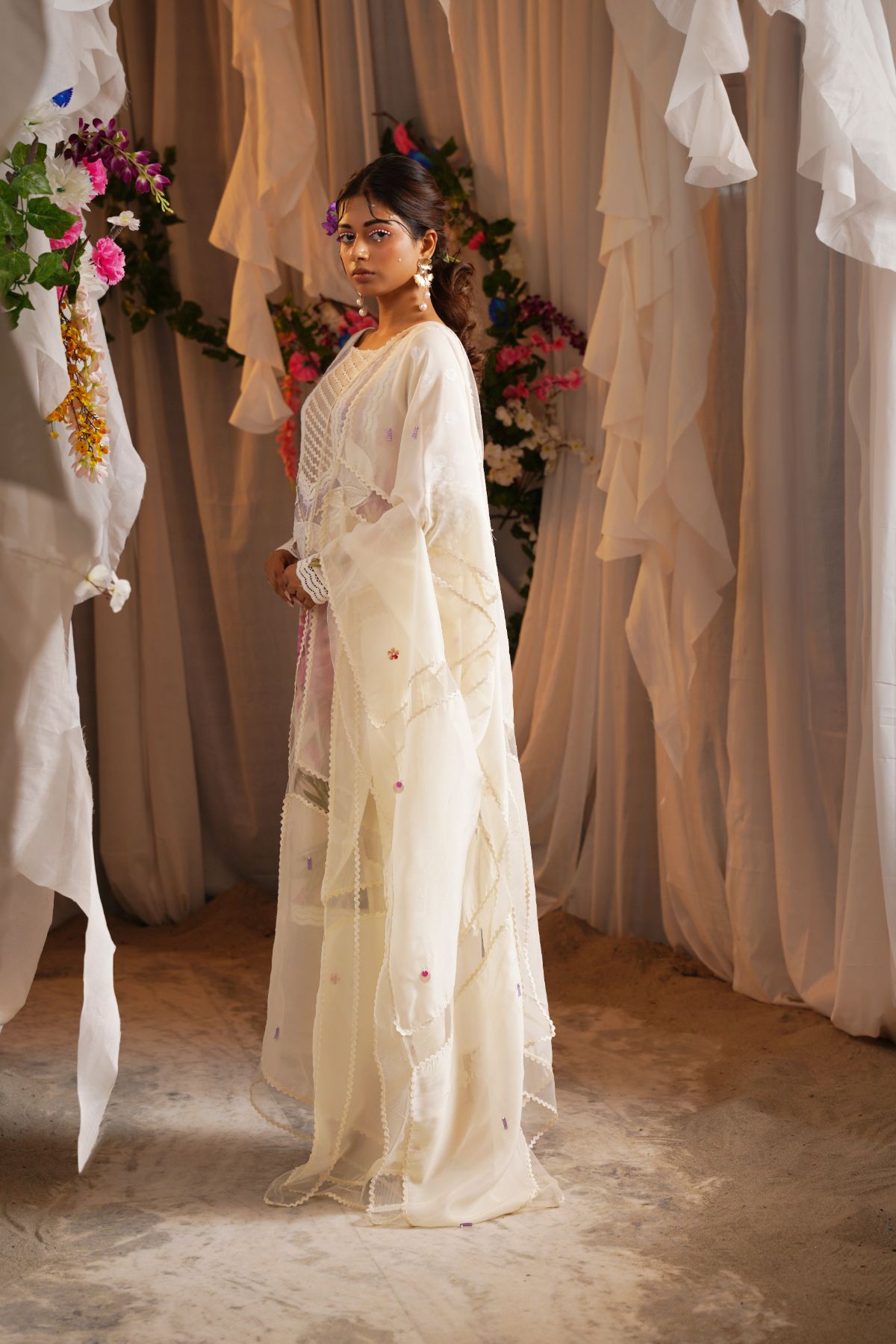 Embroidered yoke and sleeves; paneled dupatta with sequin work; sequin and floret dandling on pants